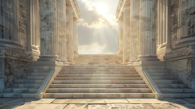 Sunburst through doric colonnade at sunset dramatic ruins silhouette with long shadows
