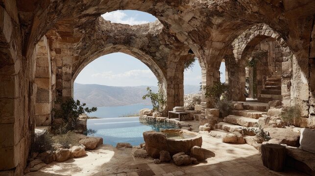 Ancient terraced stone bastion glowing in golden hour over historic ruins