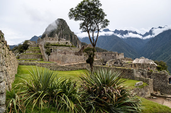 Stone built terracing and buildings at Machu Picchu, an ancient Inca archaeological site near Cusco, Peru