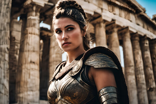 Ancient Greek warrior in armor with helmet and red cape holding sword and shield in a battle scene