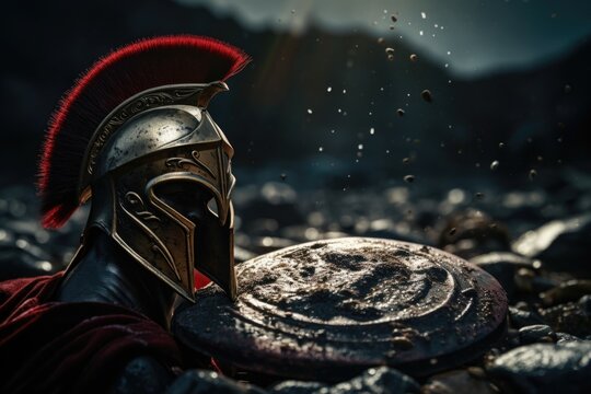 Ancient greek warrior war. Sword and helmet. Generate Ai