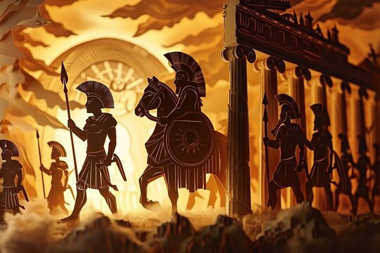 Ancient Greek warrior in armor with helmet and red cape, a battle scene