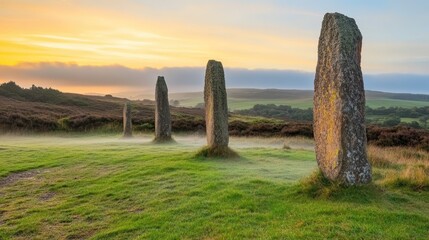 Ancient standing stones emerging from morning mist at dawn in a serene rural landscape