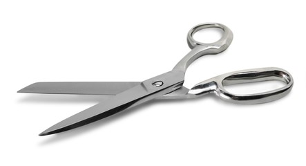 Minimalist photo of yellow children's scissors on the turquoise blue background. Flat lay shot of opened yellow scissors with copy space.