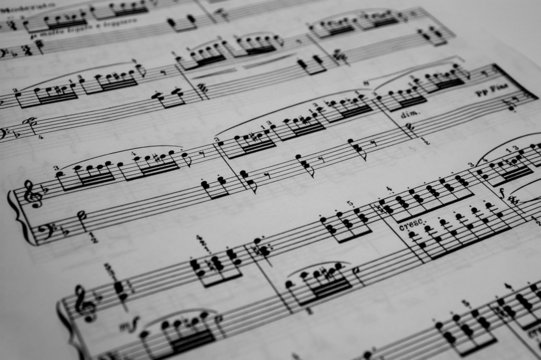 Black music notes floating on wavy lines, with a prominent treble clef, set against a stark white background