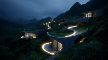 organic resort embed into a series of hills, designed by Ando Tadao,