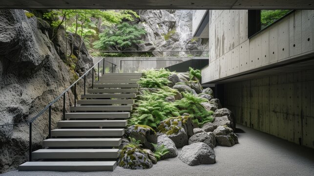 Staircase through a cave blending natural stone and modern concrete design