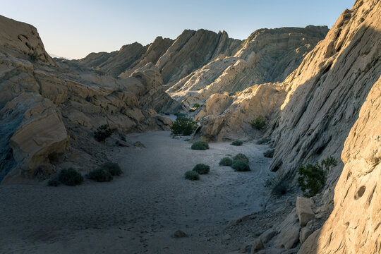Scenic rocky canyon landscape with green shrubs