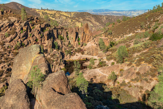 Rock formations in Pinnacles National Park in California, the destroyed remains of an extinct volcano on the San Andreas Fault. Beautiful landscapes, cozy hiking trails for tourists and travelers.