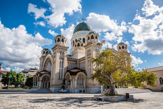 Agios Andreas the landmark church and the metropolis of Patras on a beautiful day with perfect sky color and few clouds, Achaia, Peloponnese, Greece