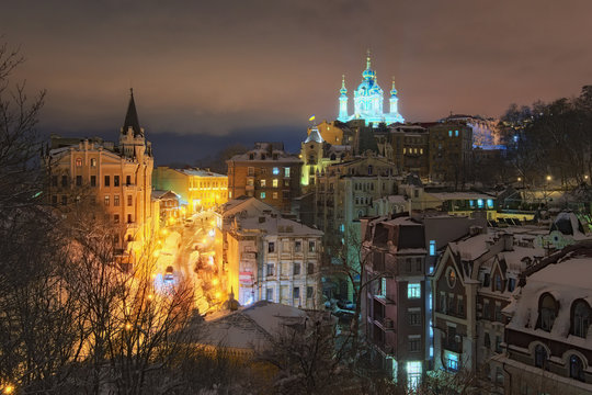 View of the Andreevsky Descent and St. Andrew's Church at background in winter evening. The street, often advertised by tour guides and operators as "Montmartre of Kyiv", is a major tourist attraction