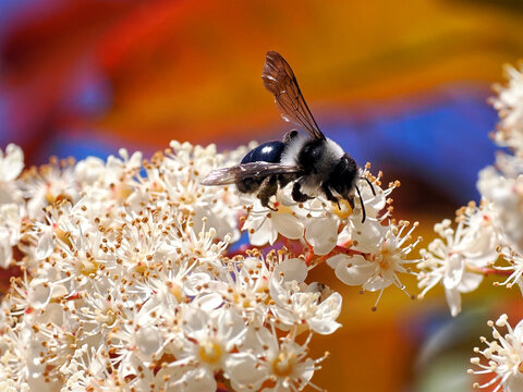 Macro of Ashy mining bee (Andrena cineraria) foraging flowers of photinia