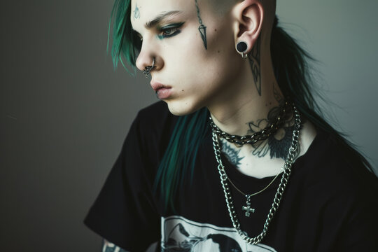 portrait of young authentic androgynous woman with short haircut and colored green, genuine smiling lesbian woman using smartphone, happy girl with piercing and street fashion dress code