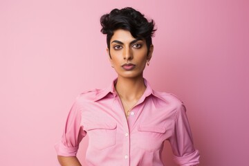 non binary model with a stylish haircut poses confidently against a soft pink background, exuding an air of strength and poise