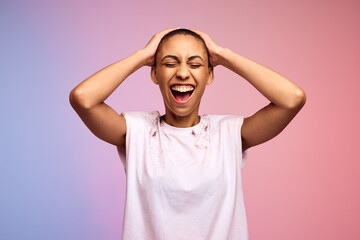 A striking photo of an androgynous man with red hair and facial piercings, sporting a white tank top against a vibrant blue background.