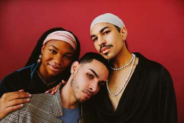 Three confident multi ethnic friends against red background