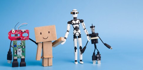Four different handmade robots on blue background