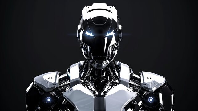 Metallic Futuristic Robot Bust with Glowing Lenses on Dark Studio Background, 3D Illustration