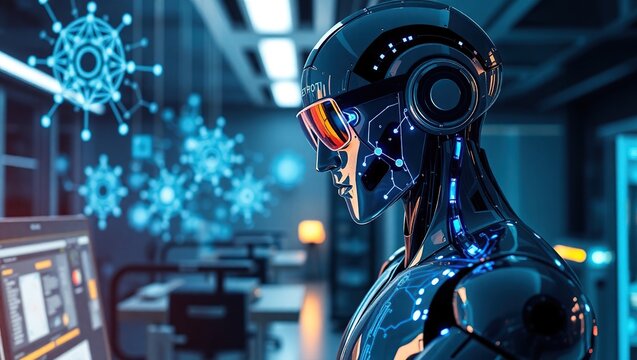 Futuristic humanoid figure with glowing outlines and cybernetic features in a dark background.