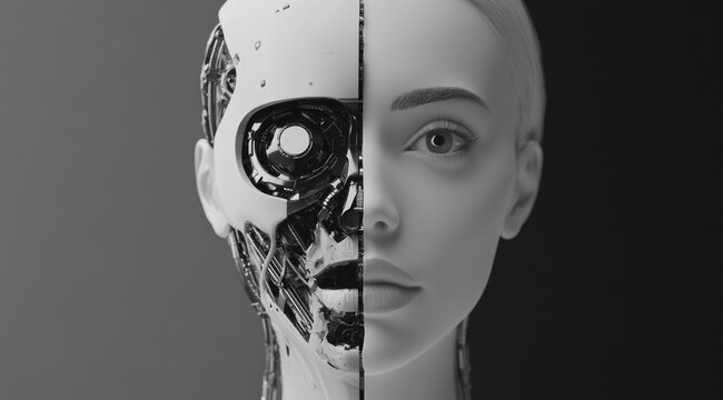 Futuristic duality: A cyborg face merging human visage with technological intricacies and