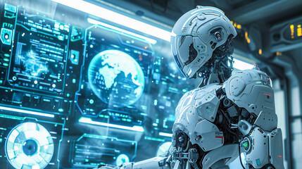 An advanced humanoid android or robot operating a computer interface in a lab or spaceship