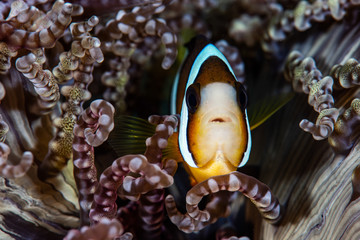 Clown Anemonefish, Amphiprion percula, swimming among the tentacles of its anemone home. Romblon, Anilao, Phillippines.