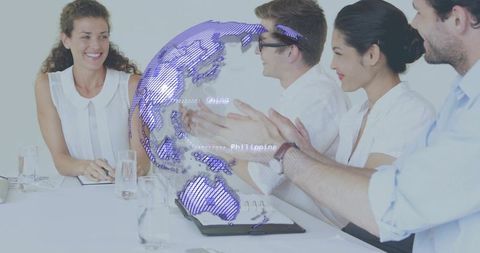 Team applauding and collaborating with digital globe overlay in bright modern office