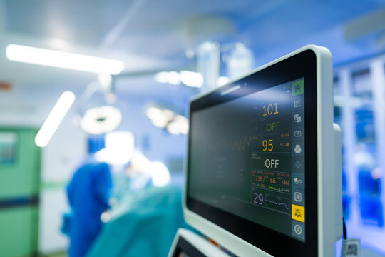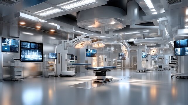 High-tech surgical environment featuring multiple screens displaying patient data and medical imaging while a procedure takes place