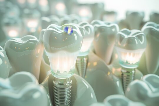 The concept of dental implants. A 3D rendering showing a dental implant placed between teeth