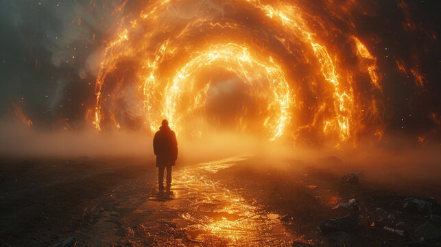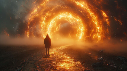 Man entering unknown yellow glowing portal, afterlife experience concept