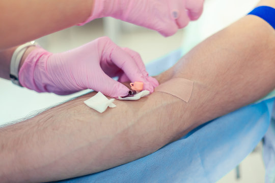 Preparation for surgery. Medical nurse with pink latex gloves inputs catheter to vein patient for drip of chemotherapy or another liquid medicine, jection of propofol to patient for iv anesthesia.