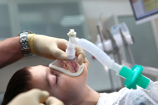 A child with an oxygen mask on his face. Preparing the child for anesthesia. Dental surgery under general anesthesia. Surgical intervention. Dental treatment under general anesthesia. Side view.