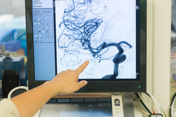 Radiologist analyzing brain mri angiography on monitor, wearing glasses and lab coat