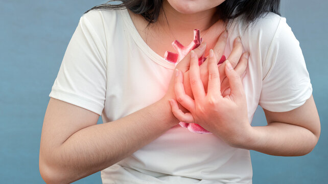 heart disease concept. woman pressing on chest with painful expression. severe heartache and having heart attack or painful cramps