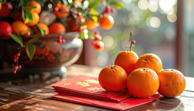 Still life of oranges and red envelopes placed on a table with a blurred background of foliage, suggesting a festive and vibrant setting