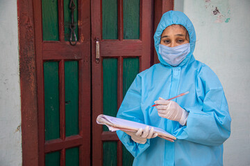 Women nurse workers in ppe kit doing door to door surveys in Indian village regarding Covid-19.