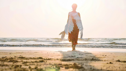 Beautiful female angel walking barefoot toward the sea at sunset.