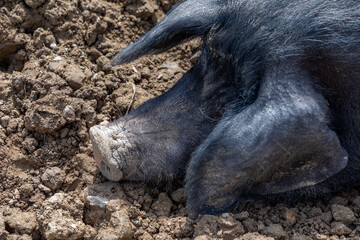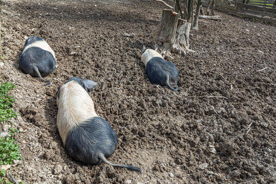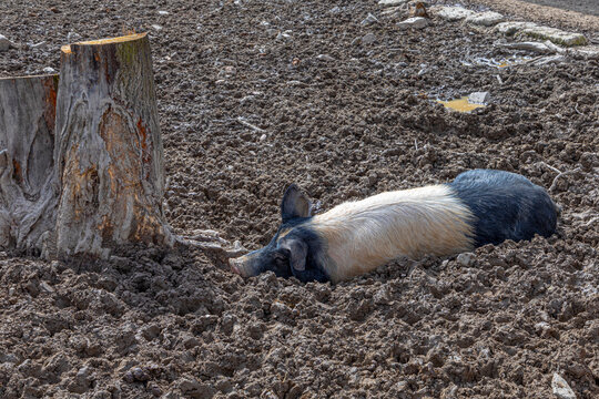 the pig, also known as the Angler Sattelschwein enjoys the mud