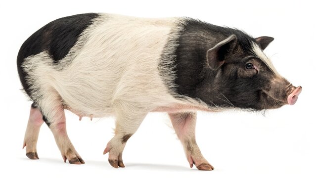 Closeup of Angeln Saddleback pig grazing on the meadow