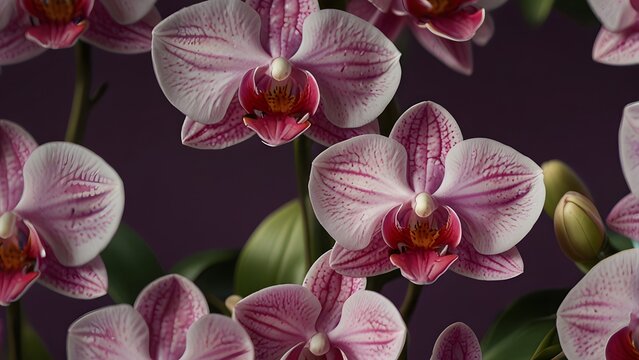 A dense cluster of exotic Phalaenopsis orchids, a variety of the Indonesian national flower known as Anggrek Bulan, is displayed with its intricately striped pink petals. Luxurious tropical flora conc