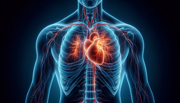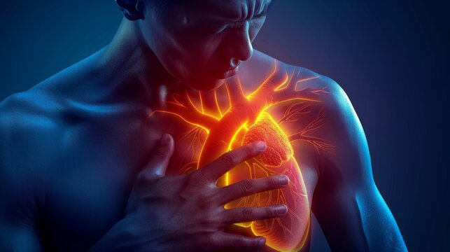 Man experiencing intense chest pain, possibly indicating a heart attack, angina pectoris, or heartburn, highlighted by a glowing orange spot on his chest