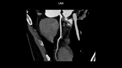 Left anterior descending (LAD, interventricular) artery branches curve with computed tomography angiography, CTA coronary angiogram