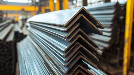 Steel angle iron in bulk galvanized available at the metal products warehouse and industrial stockyard for industrial applications