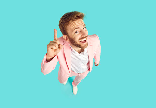 Funny young man in trendy pink suit standing isolated on blue background has good, clever, genius idea, looks at camera with happy face expression, and points his forefinger up. High angle view shot