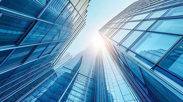 Looking up, a view captures the convergence of high-rise buildings against a crisp, blue sky, symbolizing growth, ambition, and modern architectural design in London
