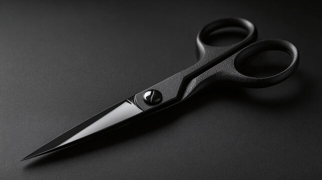 Open steel scissors with black handles resting on a matte black background, angled perspective creating depth, cutting tool.