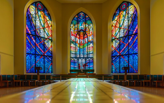 Interior of gothic church with stained glass windows