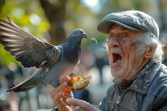 Pigeon rob homeless man stealing his pizza. Old person fight with angry city bird close up.