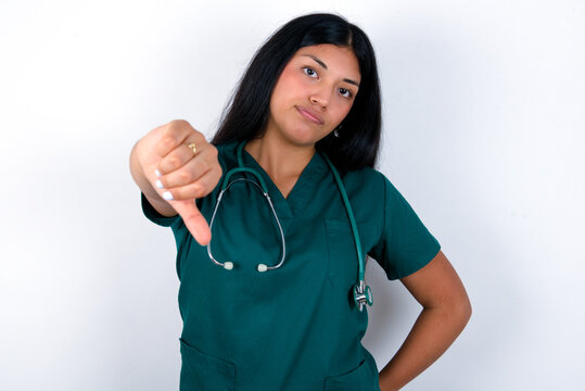 Doctor hispanic woman wearing surgeon uniform over white wall feeling angry, annoyed, disappointed or displeased, showing thumbs down with a serious look