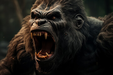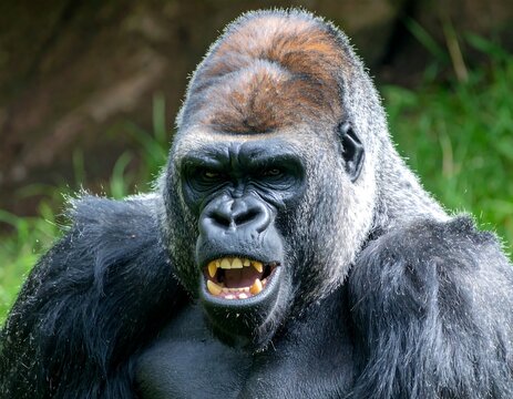 Silverback - adult male of a gorilla face. A gorilla appears to be angry, mouth open, yawning
